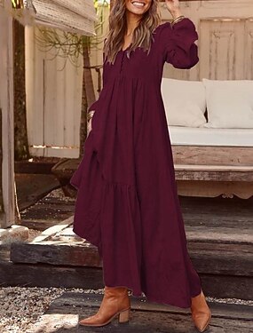 Damen Langes Kleid Maxikleid Kunstbaumwollleinen Shiftkleid Klassisch Täglich Ferien Ausgehen Normale Passform Einfach Langarm V Ausschnitt Schwarz Weiß Wein Dunkelgray Sommer