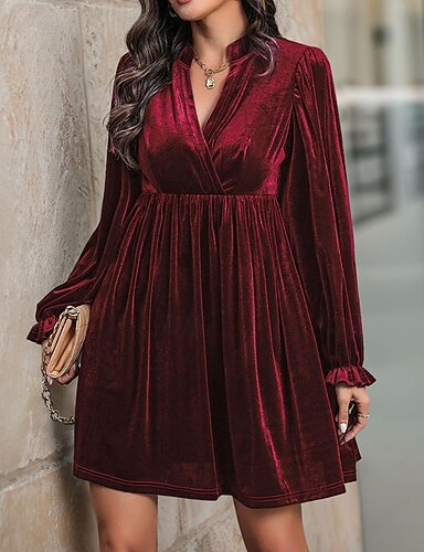 Damen Minikleid Samtkleid Paillettenkleid Cocktailkleid Einfarbiges Kleid Lässig Weihnachten Party Straße Normale Passform Einfach Langarm V Ausschnitt Wein Herbst Winter