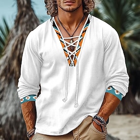 Herren Hemd Leinenhemd Wikinger-Stil Sommerhemd Strandhemd Vintage-Shirt Einfarbig Urlaub Lässig Schwarz Weiß Grün Langarm V Ausschnitt Sommer Frühling Bekleidung Kordelzug