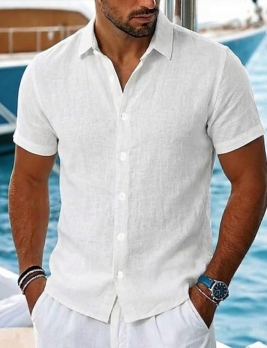 Herren Hemd Leinenhemd Sommerhemd Strandhemd Einfarbig Urlaub Kreuzfahrt Schwarz Weiß Kurzarm Rundhals Sommer Frühling Bekleidung