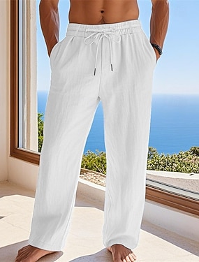 Herren Leinenhosen Hose Sommerhose Strandhose Kordelzug Elastischer Bund Gerader Schnitt Einfach Komfort Atmungsaktiv Volle Länge Outdoor Täglich Ferien Urlaub Mode Schwarz Weiß