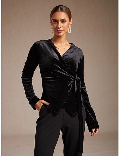 Damen Samt Wickeloberteile Elegante Oberteile Vorderknoten Einfarbig Einfach Elegant Stilvoll Basic Langarm V Ausschnitt Normale Oberteile Schwarz Winter