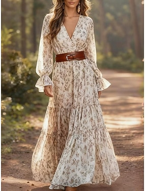 Damen Maxikleid Boho-Kleid Freizeitkleid A Linie Kleid Blumenkleid Elegant Mode Modern Outdoor Urlaub Ausgehen Normale Passform Blumen Langarm V Ausschnitt Beige Sommer Frühling