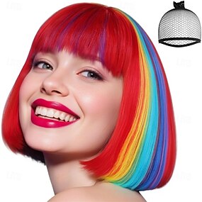 Karnevalsperücke 2026 Rot Blau Orange Glatt Bob Kurz Synthetische Festivalperücke Karneval Parade Cosplay-Kostümfrisur für Damen