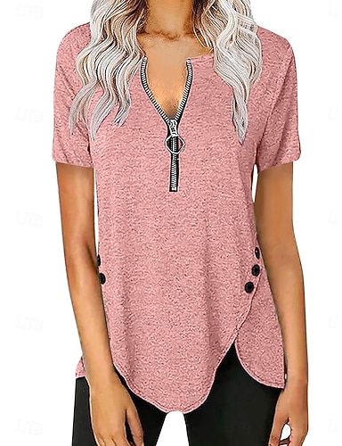 Damen T Shirt Einfach Mode Modern Lässig Kurzarm V Ausschnitt Normale Oberteile Täglich Wochenende Reißverschluss Schwarz Weiß Rosa Sommer Frühling