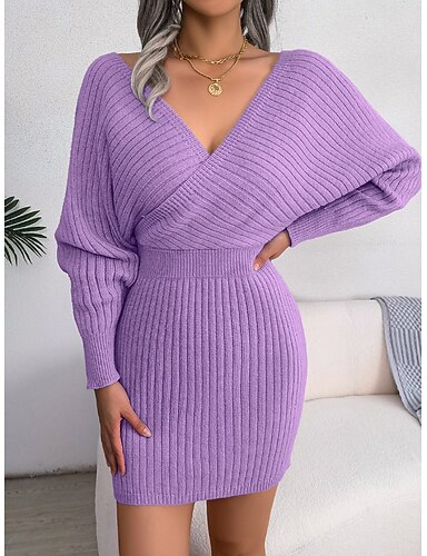 Damen Pullover Pullover Kleid Lässig Weich Einfarbig Gerippt V Ausschnitt Gestrickt Langarm Lange Oberteile Stricken Outdoor Party Täglich Schwarz Weiß Frühling Herbst