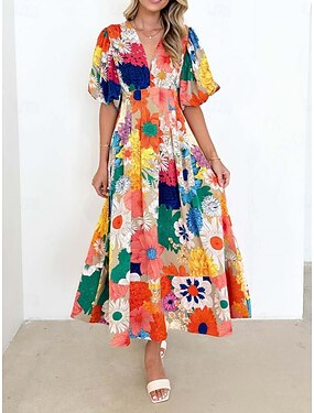 Damen Maxikleid A Linie Kleid Lässig Täglich Strand Normale Passform Blumen Grafik Geometrisch Kurzarm V Ausschnitt Hellgelb Champagner Rote Regenbogen Sommer Frühling
