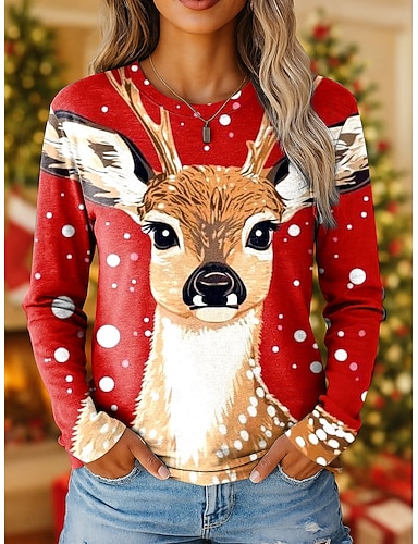 Weihnachten Damen T Shirt Grafik Rentier Vintage Stilvoll Klassisch Langarm Rundhalsausschnitt Normale Oberteile Wochenende Druck Blau Rote Purpur Orange Herbst Winter