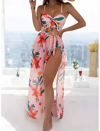 Damen Badeanzug Bikini Dreiteilig Slips Bademode Gerafft Urlaub Strandbekleidung Blumen Grafik V Ausschnitt Ärmellos Badeanzüge