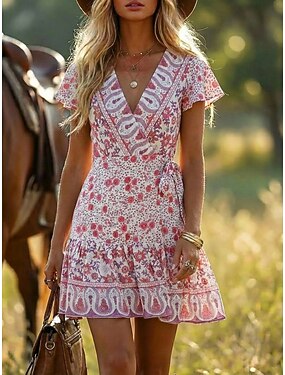 Damen Minikleid Boho-Kleid Freizeitkleid Blumenkleid Elegant Mode Modern Outdoor Urlaub Ausgehen Normale Passform Blume Kurzarm V Ausschnitt Rosa Rote Burgunderrot Königsblau Sommer Frühling