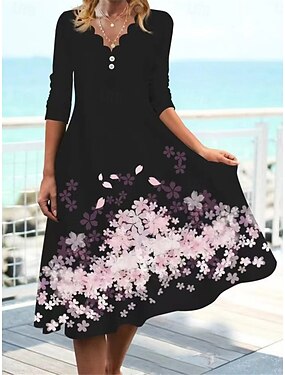 Damen Knielanges Kleid Shiftkleid Lässig Normale Passform Blumen Grafik Blatt Dreiviertelarm Rundhalsausschnitt Blau Rosa Grün Sommer Frühling