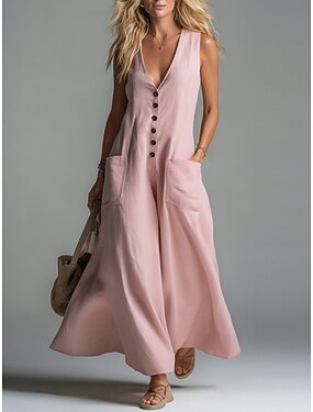 Maxikleid für Damen aus Leinenimitat, Etuikleid, Sommerkleid, lässiges Alltagskleid, normale Passform, schlicht, ärmellos, V-Ausschnitt, schwarz, weiß, rosa, aprikosenfarben