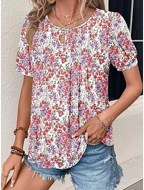 Damen T Shirt T-Shirt Gerafft Druck Blumen Grafik Mode Stilvoll Lässig Kurzarm Rundhalsausschnitt Normale Oberteile Täglich Ausgehen Wochenende Weiß Rosa Rote Violett Purpur Sommer Frühling