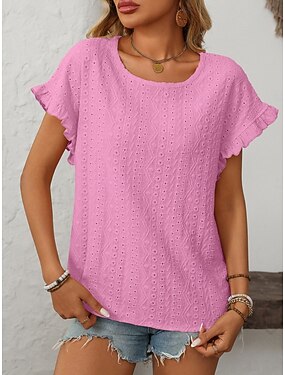 Damen T-Shirts mit Lochstickerei Rüsche Ausschnitt Raffhalter Einfarbig Elegant Vintage Stilvoll Kurzarm Kappe Rundhalsausschnitt Rundhals Normale Oberteile Lässig Täglich Ausgehen Weiß Rosa Wein