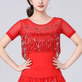 Lateinamerikanischer Tanz Oberteil Quaste Unifarbe Spleißen Damen Leistung Training Kurzarm Hoch Polyester