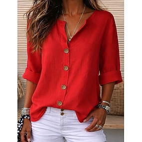 Damenblusen aus 100 % Baumwolle, geknöpft, einfarbig, Basic, lässig, 3/4-Ärmel, V-Ausschnitt, normale Passform, für den Alltag, schwarz, weiß, rot, khaki, Sommer