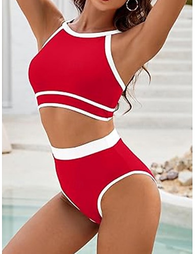 Damen Bikini 2-teiliges Badeanzug Farbblock Panties Slim Rückenfreier Urlaub Strandbekleidung Streifen Halter-Ausschnitt Ärmelloser Badeanzug