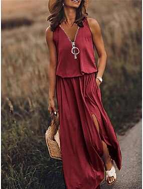 Damen Freizeitkleid einfarbig Reißverschlusstasche V-Ausschnitt Maxi langes Kleid Basic Casual Alltag ärmellos Sommer Frühling