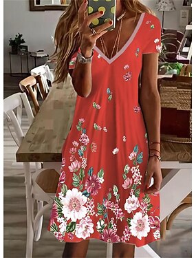 Damen Minikleid Sommerkleid T-Shirt-Kleid A Linie Kleid Urlaub Lässig Boho Strand Ausgehen Normale Passform Blumen Grafik Kurzarm V Ausschnitt Blau Rosa Rote Grün Sommer Frühling