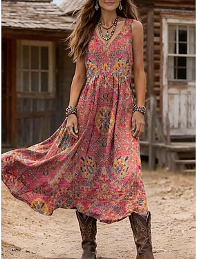 Damen-Midikleid im Western-Boho-Stil für Musikfestivals, A-Linien-Kleid, rückenfreies Kleid, Urlaubskleid, Freizeitkleid, normale Passform, grafisches geometrisches Muster, ärmellos, V-Ausschnitt,