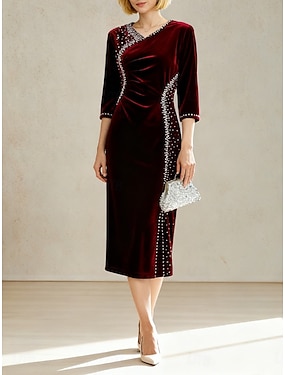 Damen Midikleid Figurbetontes Kleid Elegant Abendgesellschaft Perlenbesetzt Normale Passform Einfarbig Dreiviertelarm V Ausschnitt Blau Rote Purpur