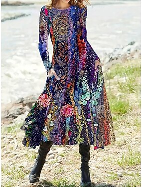 Damen Knielanges Kleid Freizeitkleid T-Shirt-Kleid Sommerkleid A Linie Kleid Elegant Urlaub Lässig Normale Passform Blumen Grafik Langarm Rundhalsausschnitt Rosa Rote Blau Grün Herbst Winter