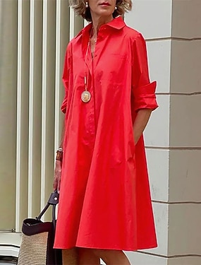 Damen-Hemdkleid, Freizeitkleid, Etuikleid, einfarbig, Knopfleiste, Tasche, Hemdkragen, Midikleid, lässig, täglich, langärmelig, Sommer, Frühling