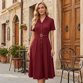 1950er Rockabilly Midlänge Kleid Kurze Ärmel Mit Gürtel Einfarbig Umlegekragen Kostüm Damen Lässig Alltagskleidung Teegesellschaft Erwachsene Kleid Frühling & Sommer