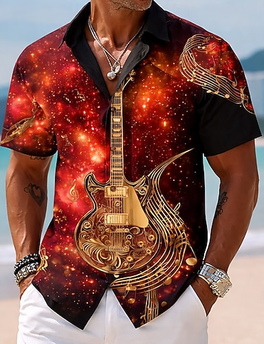 Herren Sternenklarer Himmel Gitarre Musikinstrument Hemd Knopfhemd Kurzarm Künstlerisch Vintage-Retro Musikfestival Ferien Sommer Frühling Umlegekragen 3D-Druck Hemden mit Kragen Rote Purpur Braun