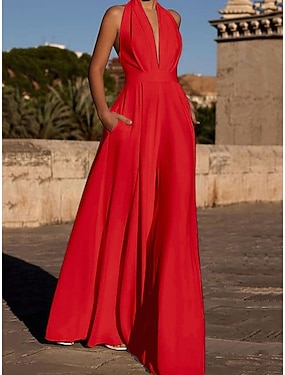 Damen Normal Overall Elegant Einfarbig Ärmellos Weites Bein V Ausschnitt Patchwork Rückenfrei Urlaub Heim Lässiger Schnitt Schwarz Rote Sommer