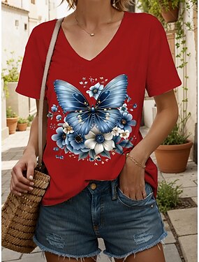 Damen T Shirt Druck Blumen Grafik Schmetterling Vintage Stilvoll Klassisch Kurzarm V Ausschnitt Normale Oberteile Täglich Ausgehen Wochenende Blau Schwarz Weiß Gelb Rosa Sommer Frühling