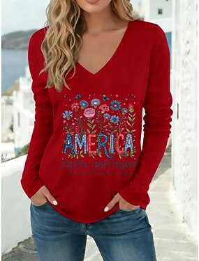 Amerikanischer Unabhängigkeitstag Damen T Shirt T-Shirt Druck Blumen Grafik Stilvoll Klassisch Lässig Langarm V Ausschnitt Normale Oberteile Täglich Ausgehen Blau Weiß Rote Hellgrau Sommer Frühling