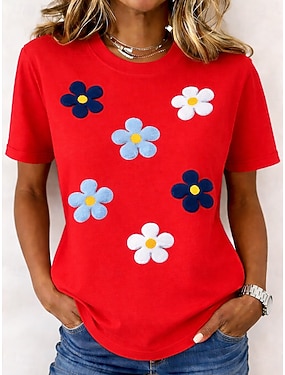 Damen T Shirt Druck Blumen Mode Kurzarm Rundhals Normale Oberteile Urlaub Wochenende Blau Gelb Rosa Rote Sommer