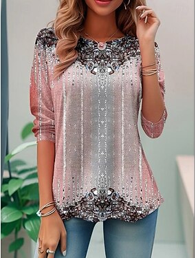 Damen T Shirt Druck Grafik Geometrisch Abstrakt Mode Stilvoll Klassisch Langarm Rundhalsausschnitt Normale Oberteile Täglich Blau Rosa Rote Sommer Frühling