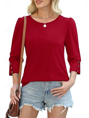 Damen T Shirt T-Shirt Knöpfe Einfach Mode Stilvoll Klassisch Dreiviertelarm Rundhalsausschnitt Normale Oberteile Täglich Ausgehen Wochenende Blau Schwarz Weiß Rosa Rote Sommer Frühling Herbst