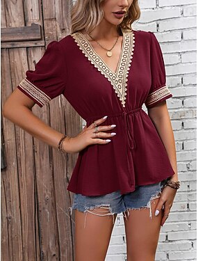 Damen Boho-Hemd Tunika Spitze Einfach Mode Kurzarm V Ausschnitt Normale Oberteile Täglich Urlaub Schwarz Weiß Rote Grün Sommer