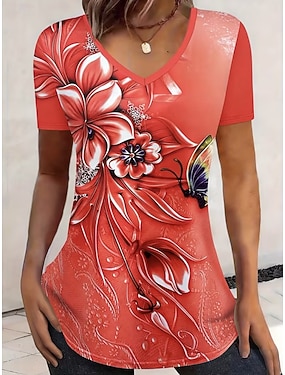 Damen T Shirt Druck Ombre Blumen Grafik Stilvoll Klassisch Lässig Kurzarm V Ausschnitt Normale Oberteile Täglich Blau Rote Orange Grau Sommer Frühling