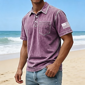 Herren Amerikanische US-Flagge Acid-Wash-Shirt 100% Baumwolle Kurzarm Polo-Shirts Revers Hawaiianisch Lässig Athleisure Urlaubskleidung Tasche 3D-Druck Knöpfe Frühling & Sommer Blau Rote Grün