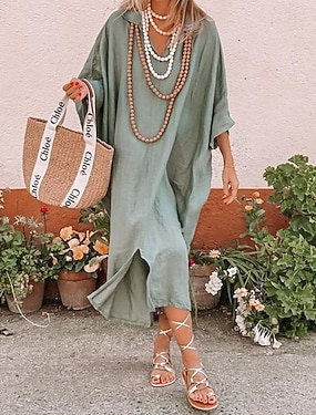 Damen Midikleid Kunstbaumwollleinen Kaftan Kleid Modern Täglich Outdoor Urlaub Lässiger Schnitt Einfach Langarm Hemdkragen Grün Sommer Frühling