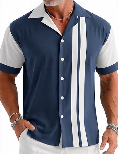 Herren Geometrisch Gestreift Hemd Bowlinghemd Camp-Kragenhemd Kurzarm Modisch lässig Streetwear Urlaub Sommer Frühling Kubanisches Halsband 3D-Druck Hemden mit Knopfleiste Purpur Grün Khaki Dunkelblau