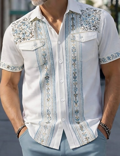 Herren Blumendruck Ethnisch Blumen Hemd Guayabera Hemd Knopfhemd Kurzarm Vintage-Retro Urlaub Alltagstauglich Sommer Frühling Umlegekragen 3D-Druck Zwei Fronttaschen Leinenähnliches Hemd Blau Wei
