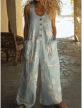 Damen-Jumpsuit aus Leinenimitat mit normalem Schnitt, Blumenmuster, ärmellos, weitem Bein, U-Ausschnitt, Taschen und Knöpfen, lockerer Passform, ideal für Urlaub und Freizeit, in Blau, Braun und Grün,