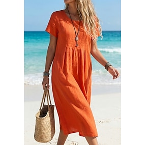 Damen Midikleid Shiftkleid Baumwoll-Leinen-Kleider Sommerkleid Mode Lässig Täglich Normale Passform Einfarbig Kurzarm V Ausschnitt Hellgrün Dunkelgrün Orange Dunkelgrau Sommer