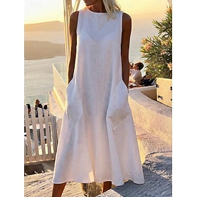 Damen Maxikleid Kunstbaumwollleinen Shiftkleid Sommerkleid Weißes Kleid Streetwear Lässig Urlaub Lässiger Schnitt Ärmellos Rundhalsausschnitt Schwarz Weiß Gelb Grau Sommer
