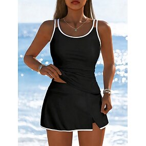 Damen Badeanzug Tankini Zweiteilig Rock Bademode Bauchkontrolle Hohe Taille Schlank Rückenfrei Urlaub Strandbekleidung Einfarbig U-Ausschnitt Ärmellos Badeanzüge