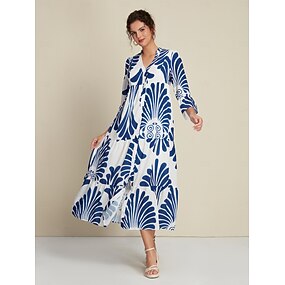 Damen Lockeres Kleid Resortkleidung Maxikleid Marineblau Dreiviertelarm Folk Drucken Frühling & Sommer V-förmiger Draht-Ausschnitt Urlaub Lässig S M L