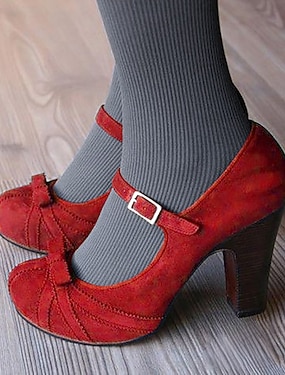 Damen-Vintage-Mary-Jane-Pumps mit Schleifenverzierung – rote Wildlederschuhe mit klobigem Mittelabsatz für formelle Anlässe
