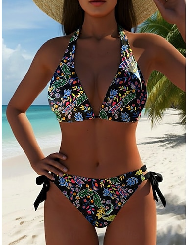 Damen Bikini 2-teilig Badeanzug Boho Cheeky Offene Rückseite Sexy Druck Urlaub Fashion Blume V Draht Ärmellos Bademode