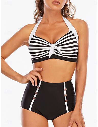 Damen Badeanzug Bikini Zweiteilig Hohe Taillenlinie Bademode Schlank Rückenfrei Urlaub Strandbekleidung Gestreift Neckholder Ärmellos Badeanzüge