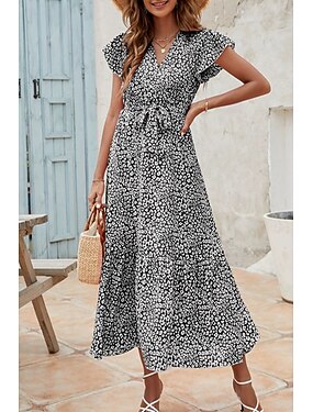 Damen Midikleid Boho-Kleid Chiffonkleid Boho Chic Kleider Elegantes Kleid Elegant Bohemien Vintage Täglich Urlaub Date Schlank Blumen Kurzarm V Ausschnitt Schwarz Sommer Frühling Herbst Winter